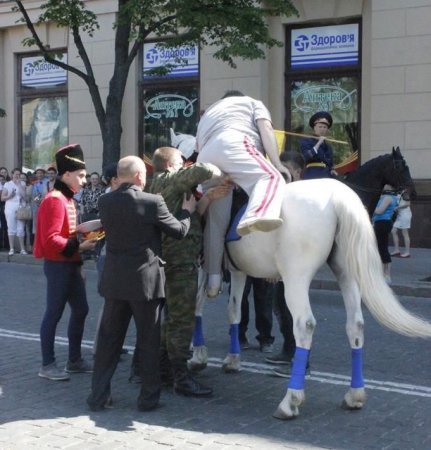 На харьковском параде в честь Дня Победы гвоздем программы был выезд генерала верхом. Благодаря помощи троих людей военному все-таки удалось взобраться на коня, которому пришлось ох как нелегко. Но самое веселое началось потом: спину генерал выровнял, а вот пузо втянуть не удалось.
